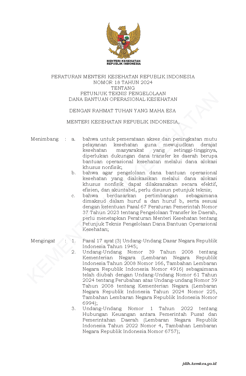 Salinan Peraturan Menteri Kesehatan Republik Indonesia Nomor 18 Tahun 2024 Tentang Petunjuk Teknis Pengelolaan Dana Bantuan Operasional Kesehatan