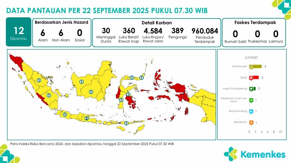 Disini anda dapat mengunduh laporan pemantauan harian berpotensi kejadian Krisis Kesehatan tanggal 22 September 2025 Lihat Laporan Pemantauan Harian Pusat Krisis Kesehatan 22 September 2025