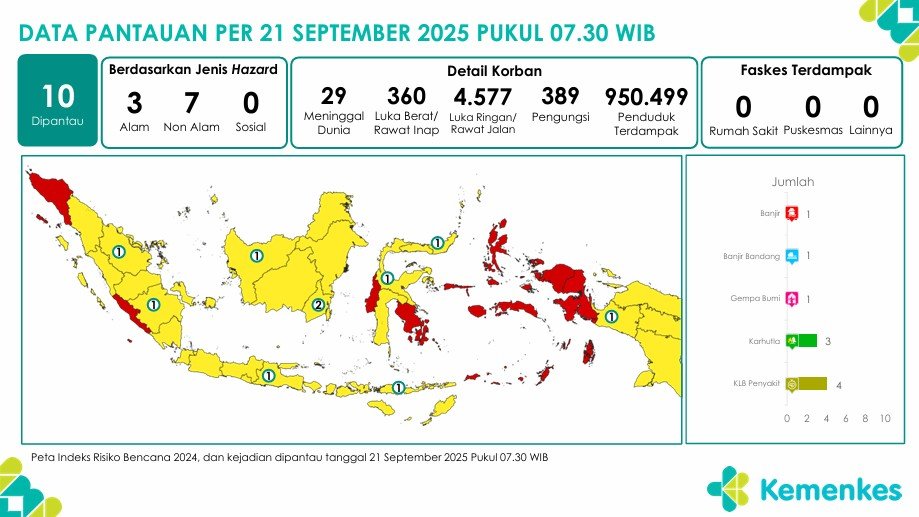 Disini anda dapat mengunduh laporan pemantauan harian berpotensi kejadian Krisis Kesehatan tanggal 21 September 2025 Lihat Laporan Pemantauan Harian Pusat Krisis Kesehatan 21 September 2025