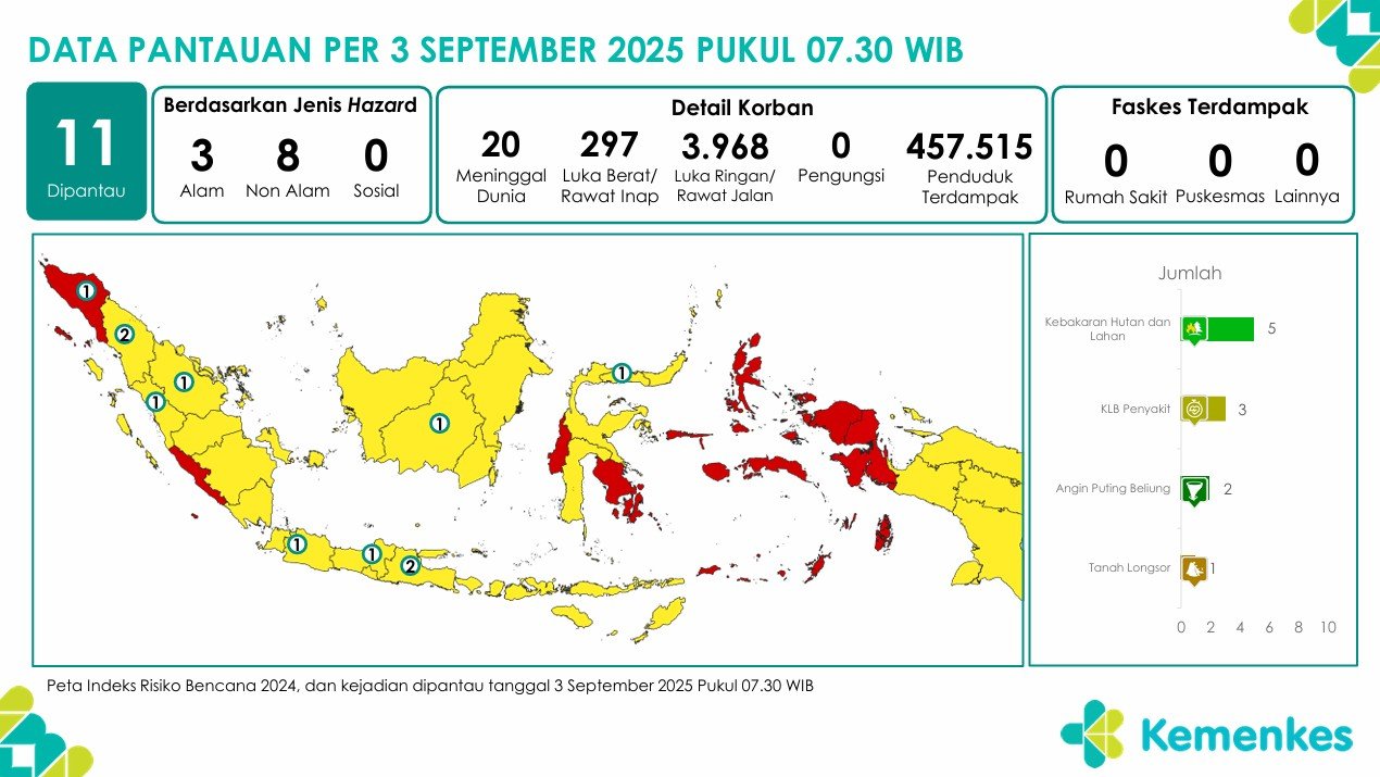 Disini anda dapat mengunduh laporan pemantauan harian berpotensi kejadian Krisis Kesehatan tanggal 3 September 2025 Lihat Laporan Pemantauan Harian Pusat Krisis Kesehatan 3 September 2025