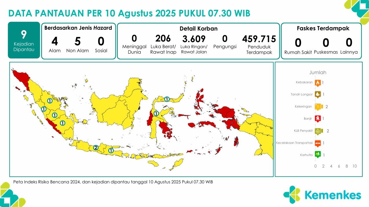 Disini anda dapat mengunduh laporan pemantauan harian berpotensi kejadian Krisis Kesehatan tanggal 9 Agustus 2025 Lihat Laporan Pemantauan Harian Pusat Krisis Kesehatan 9 Agustus 2025
