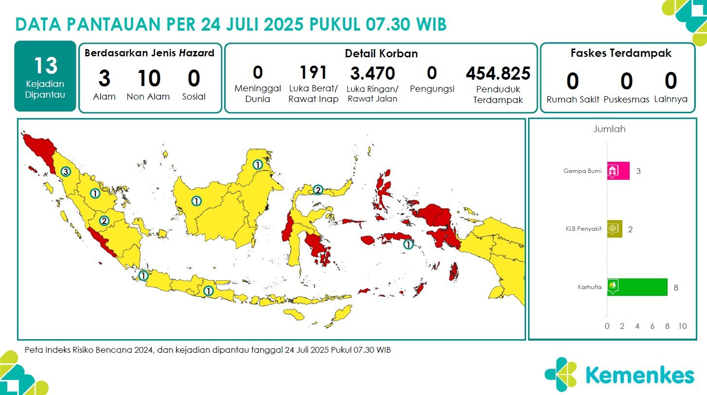 Disini anda dapat mengunduh laporan pemantauan harian berpotensi kejadian Krisis Kesehatan tanggal 24 Juli 2025 Lihat Laporan Pemantauan Harian Pusat Krisis Kesehatan 24 Juli 2025