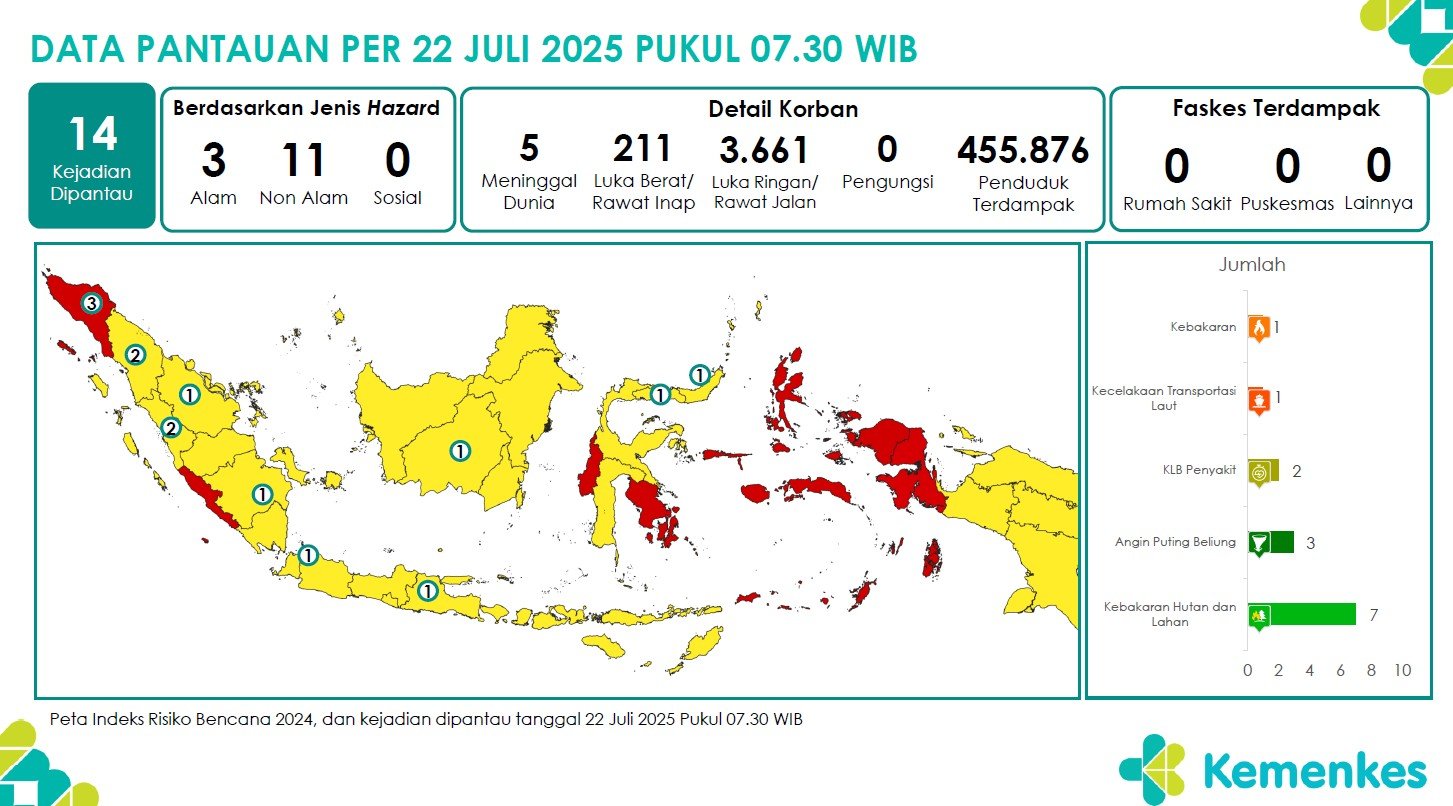 Disini anda dapat mengunduh laporan pemantauan harian berpotensi kejadian Krisis Kesehatan tanggal 22 Juli 2025 Lihat Laporan Pemantauan Harian Pusat Krisis Kesehatan 22 Juli 2025