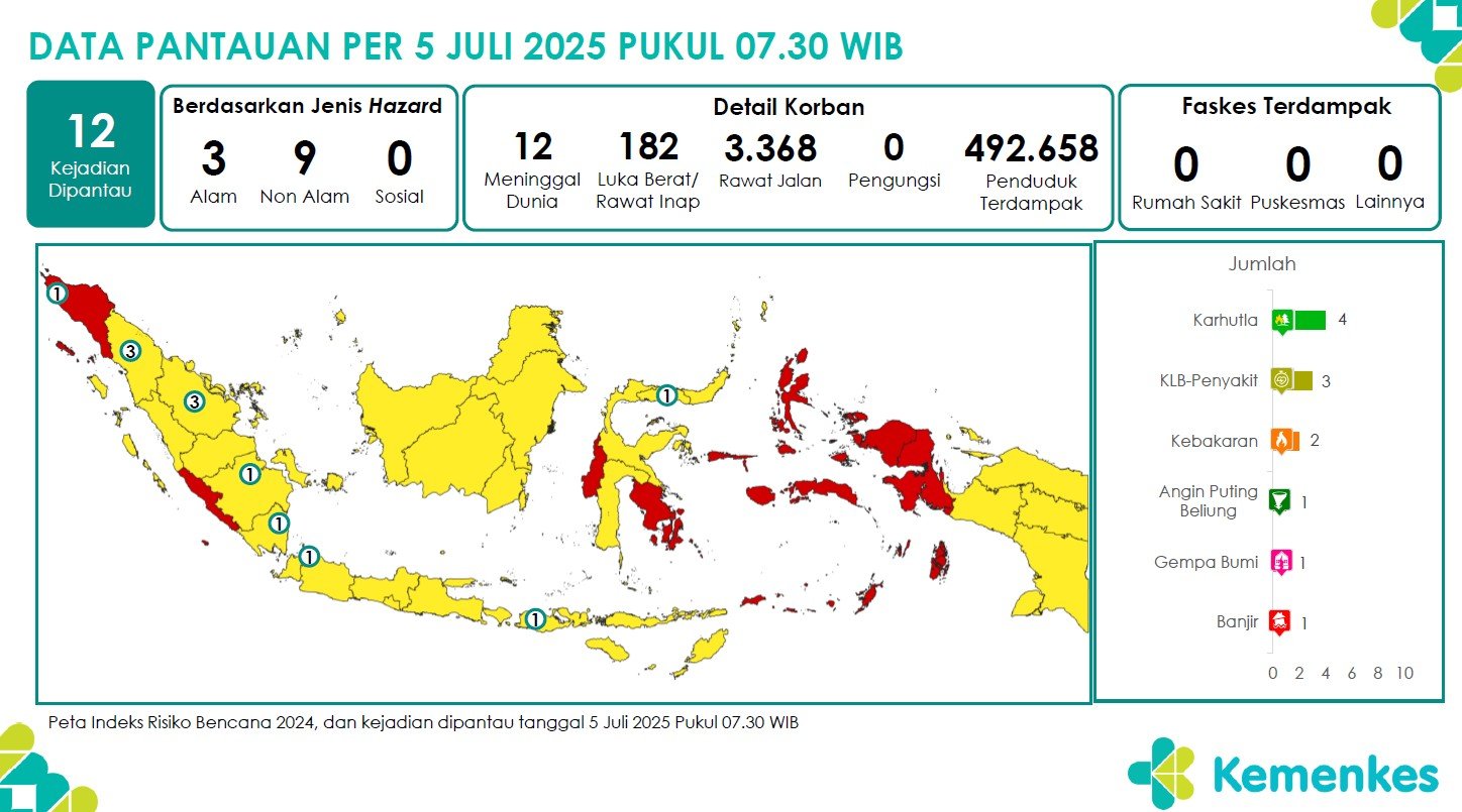 Disini anda dapat mengunduh laporan pemantauan harian berpotensi kejadian Krisis Kesehatan tanggal 5 Juli 2025 Lihat Laporan Pemantauan Harian Pusat Krisis Kesehatan 5 Juli 2025