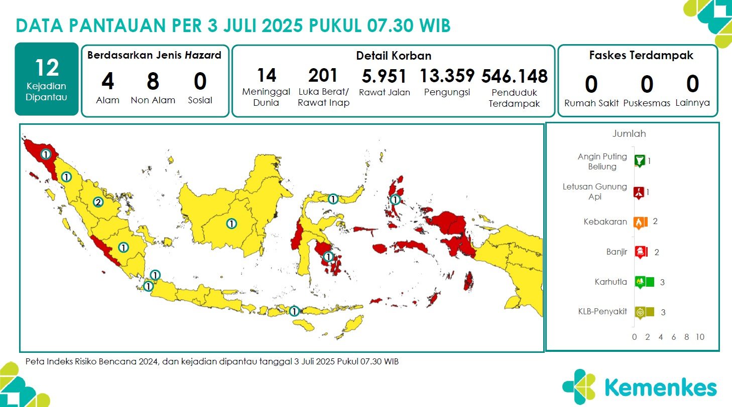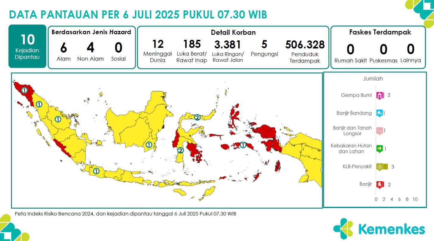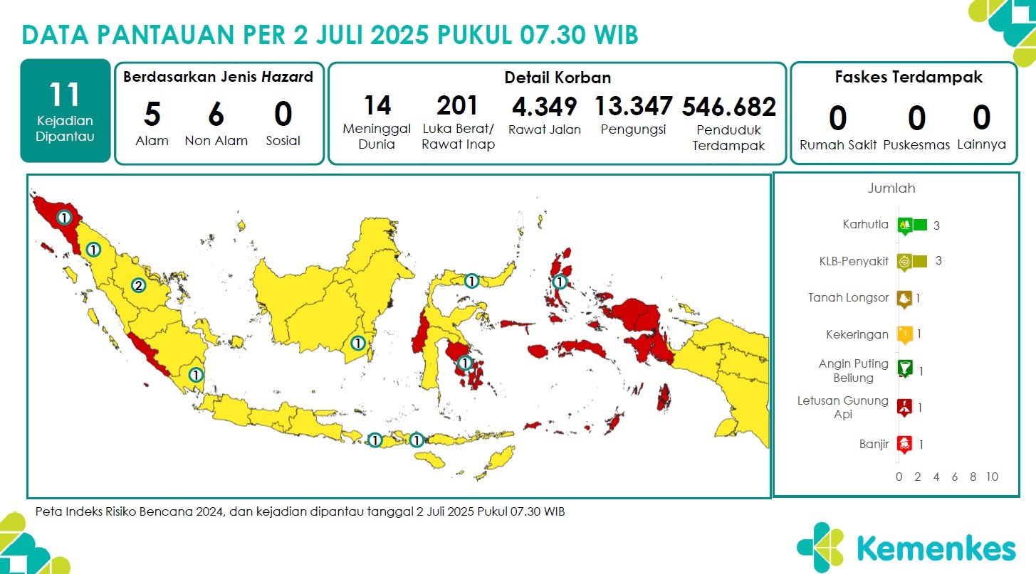 Disini anda dapat mengunduh laporan pemantauan harian berpotensi kejadian Krisis Kesehatan tanggal 2 Juli 2025 Lihat Laporan Pemantauan Harian Pusat Krisis Kesehatan 2 Juli 2025