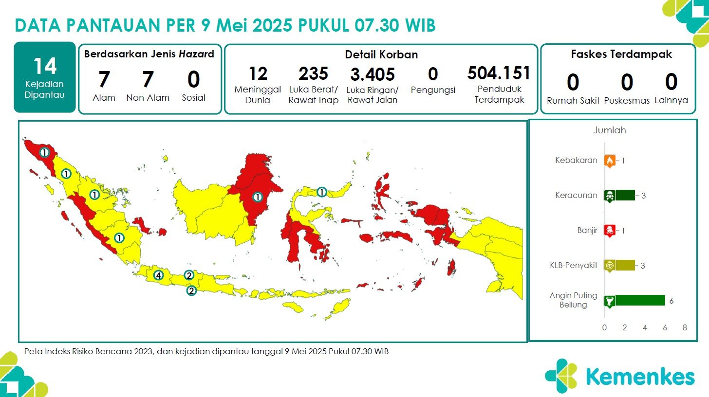 Disini anda dapat mengunduh laporan pemantauan harian berepotensi kejadian Krisis Kesehatan tanggal 9 Mei 2025 Lihat Laporan Pemantauan Harian Pusat Krisis Kesehatan 9 Mei 2025