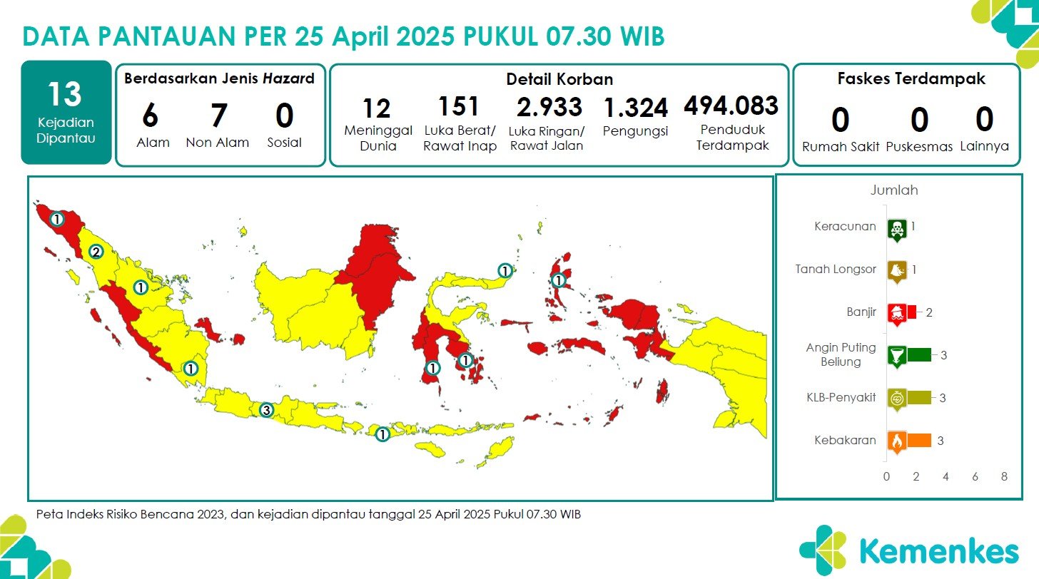 Disini anda dapat mengunduh laporan pemantauan harian berepotensi kejadian Krisis Kesehatan tanggal 25 April 2025 Lihat Laporan Pemantauan Harian Pusat Krisis Kesehatan 25 April 2025