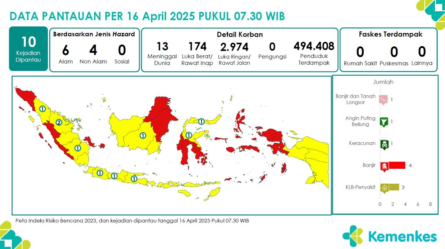 Disini anda dapat mengunduh laporan pemantauan harian berepotensi kejadian Krisis Kesehatan tanggal 16 April 2025 Unduh Laporan Pemantauan Harian Pusat Krisis Kesehatan 16 April 2025