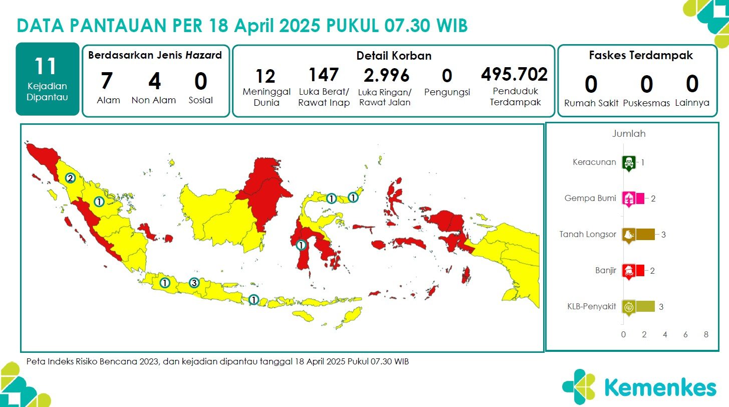 Disini anda dapat mengunduh laporan pemantauan harian berepotensi kejadian Krisis Kesehatan tanggal 18 April 2025 Unduh Laporan Pemantauan Harian Pusat Krisis Kesehatan 18 April 2025