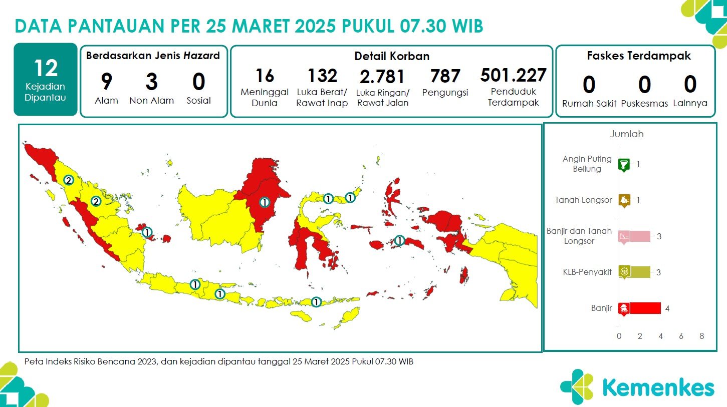 Disini anda dapat mengunduh Laporan Pemantauan Harian Kejadian Krisis Kesehatan Pusat Krisis Kesehatan Kementerian Kesehatan tanggal 24 Maret 2025 pukul 07.30 WIB hingga 25 Maret 2025 pukul 07.30 WIB. Terdapat 12 laporan kejadian bencana: 4 Banjir, 3 Banjir dan Tanah Longsor, 1 Angin Puting Beliung, 1 Tanah Longsor, dan 3 KLB Penyakit. Unduh Laporan Pemantauan Harian Pusat Krisis Kesehatan 25 Maret 2025