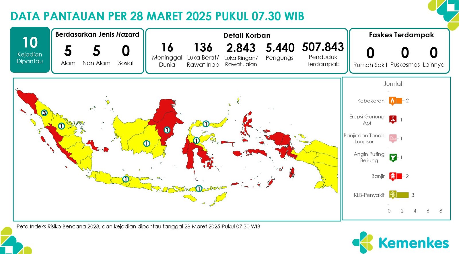 Disini anda dapat mengunduh Laporan Pemantauan Harian Kejadian Krisis Kesehatan Pusat Krisis Kesehatan Kementerian Kesehatan tanggal 27 Maret 2025 pukul 07.30 WIB hingga 28 Maret 2025 pukul 07.30 WIB. Terdapat 10 laporan kejadian bencana: 2 Banjir, 1 Angin Puting Beliung, 3 KLB Penyakit, 1 Banjir dan Tanah Longsor, dan 2 Kebakaran. Unduh Laporan Pemantauan Harian Pusat Krisis Kesehatan 28 Maret 2025