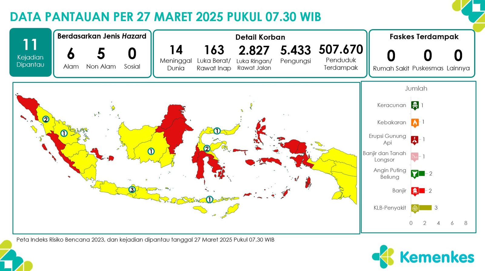 Disini anda dapat mengunduh Laporan Pemantauan Harian Kejadian Krisis Kesehatan Pusat Krisis Kesehatan Kementerian Kesehatan tanggal 26 Maret 2025 pukul 07.30 WIB hingga 27 Maret 2025 pukul 07.30 WIB. Terdapat 11 laporan kejadian bencana: 2 Banjir, 2 Angin Puting Beliung, 3 KLB Penyakit, 1 Banjir dan Tanah Longsor, 1 Keracunan, dan 1 Kebakaran Unduh Laporan Pemantauan Harian Pusat Krisis Kesehatan 27 Maret 2025