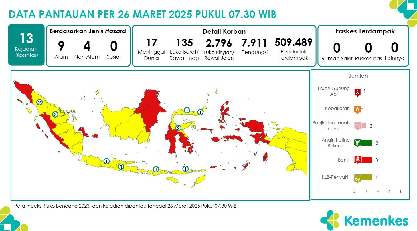 Disini anda dapat mengunduh Laporan Pemantauan Harian Kejadian Krisis Kesehatan Pusat Krisis Kesehatan Kementerian Kesehatan tanggal 25 Maret 2025 pukul 07.30 WIB hingga 26 Maret 2025 pukul 07.30 WIB. Terdapat 13 laporan kejadian bencana: 3 Banjir, 3 Angin Puting Beliung, 3 KLB Penyakit, 2 Banjir dan Tanah Longsor, 1 Tanah Longsor, dan 1 Kebakaran.Unduh Laporan Pemantauan Harian Pusat Krisis Kesehatan 26 Maret 2025