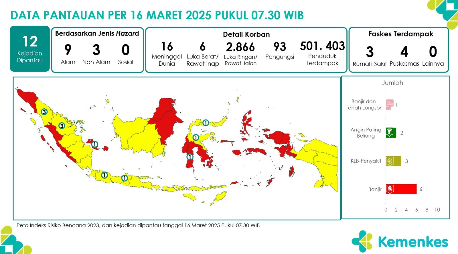 Disini anda dapat mengunduh Laporan Pemantauan Harian Kejadian Krisis Kesehatan Pusat Krisis Kesehatan Kementerian Kesehatan tanggal 15 Maret 2025 pukul 07.30 WIB hingga 16 Maret 2025 pukul 07.30 WIB. Terdapat 12 laporan kejadian bencana: 6 Banjir, 3 KLB Penyakit, 1 Banjir & Tanah Longsor dan 2 Angin Puting Beliung Unduh Laporan Pemantauan Harian Pusat Krisis Kesehatan 16 Maret 2025