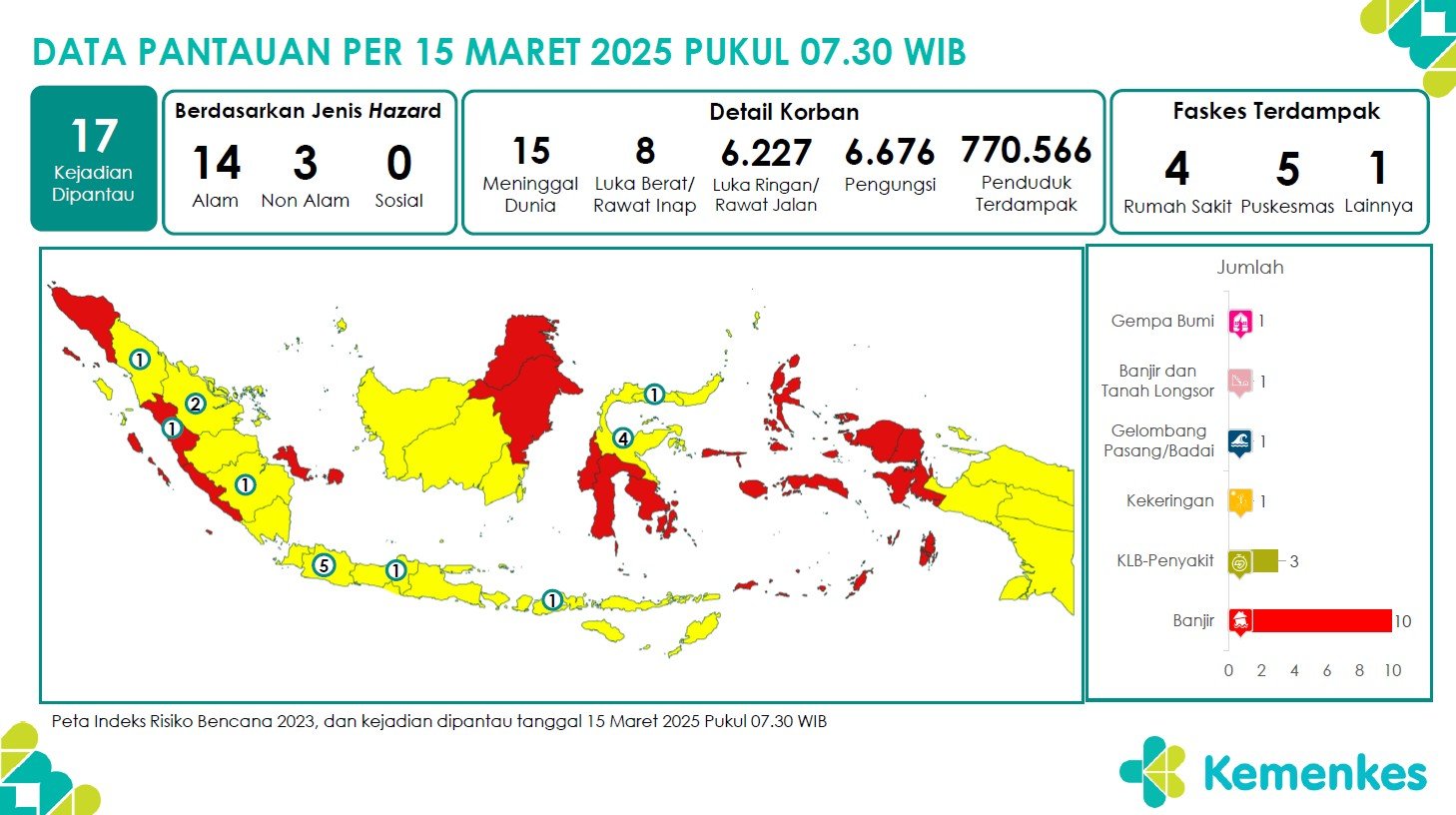 Disini anda dapat mengunduh Laporan Pemantauan Harian Kejadian Krisis Kesehatan Pusat Krisis Kesehatan Kementerian Kesehatan tanggal 14 Maret 2025 pukul 07.30 WIB hingga 15 Maret 2025 pukul 07.30 WIB. Terdapat 17 laporan kejadian bencana: 10 Banjir, 3 KLB Penyakit, 1 Banjir & Tanah Longsor, 1 Gelombang Pasang/Badai, 1 Gempa Bumi dan 1 KekeringanUnduh Laporan Pemantauan Harian Pusat Krisis Kesehatan 15 Maret 2025