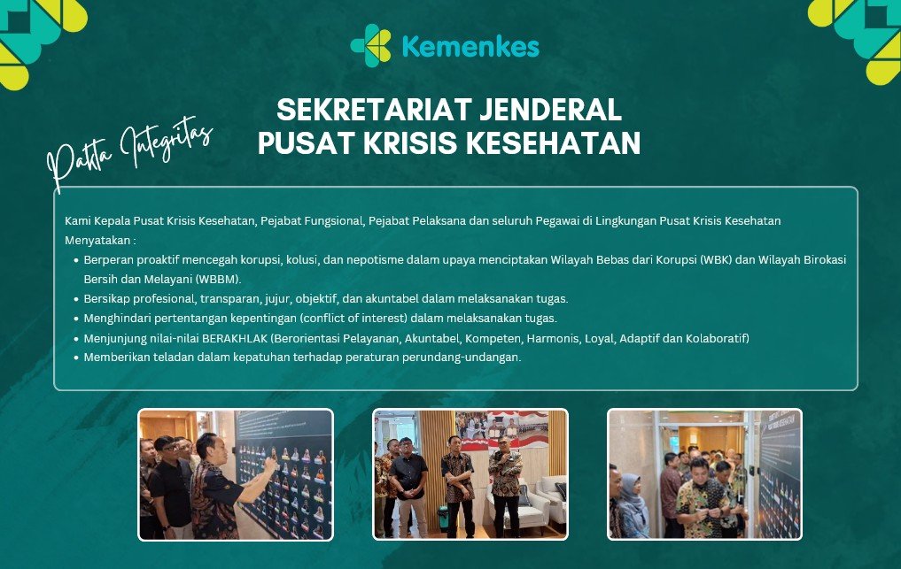Jakarta, 25 Maret 2025Dalam upaya memperkuat tata kelola pemerintahan yang bersih dan berintegritas, Pusat Krisis Kesehatan Kementerian Kesehatan secara resmi menandatangani Pakta Integritas sebagai bentuk komitmen mewujudkan Wilayah Bebas dari Korupsi (WBK). Acara ini berlangsung di Pusat Krisis Kesehatan, lt 6 Gedung Sujudi dan dihadiri oleh Kepala Pusat Krisis Kesehatan, seluruh pegawai Pusat Krisis Kesehatan dan disaksikan oleh Inspektur II, Inspektorat Jenderal Kemenkes.Pakta Integritas merupakan komitmen bersama Kepala Pusat Krisis Kesehatan dan seluruh pegawai Pusat Krisis Kesehatan,untuk bekerja dengan penuh profesionalisme, menjaga integritas, dan menghindari tindakan korupsi, kolusi, serta nepotisme. Penandatanganan ini menegaskan tekad untuk berperan aktif dalam menciptakan lingkungan kerja yang bersih, jujur, dan bebas dari praktik yang merugikan negara dan masyarakat.Isi Pokok Pakta IntegritasPakta Integritas yang ditandatangani oleh seluruh pegawai Pusat Krisis Kesehatan berisi komitmen untuk: Berperan proaktif mencegah korupsi, kolusi, dan nepotisme dalam upaya menciptakan Wilayah Bebas dari Korupsi (WBK) dan Wilayah Birokasi Bersih dan Melayani (WBBM). Bersikap profesional, transparan, jujur, objektif, dan akuntabel dalam melaksanakan tugas. Menghindari pertentangan kepentingan (conflict of interest) dalam melaksanakan tugas. Menjunjung nilai-nilai BERAKHLAK (Berorientasi Pelayanan, Akuntabel, Kompeten, Harmonis, Loyal, Adaptif dan Kolaboratif) Memberikan teladan dalam kepatuhan terhadap peraturan perundang-undangan.Penandatanganan Pakta Integritas ini sejalan dengan upaya Kementerian Kesehatan dalam memperkuat reformasi birokrasi, khususnya dalam pengelolaan krisis kesehatan yang semakin kompleks dan dinamis. Dengan adanya komitmen ini, diharapkan seluruh pegawai Pusat Krisis Kesehatan dapat menjadi teladan dalam menjalankan tugas secara profesional, bertanggung jawab, dan berorientasi pada kepentingan masyarakat.