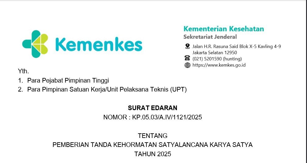 SURAT EDARANTENTANGPEMBERIAN TANDA KEHORMATAN SATYALANCANA KARYA SATYA TAHUN 2025Yth. Para Pejabat Pimpinan Tinggi Para Pimpinan Satuan Kerja/Unit Pelaksana Teknis (UPT)Dalam rangka pemberian Tanda Kehormatan Satyalancana Karya pada peringatan Hari Kemerdekaan RI ke-80 dan peringatan Hari Kesehatan Nasional ke-61 Tahun 2025, diperlukan pengaturan mengenai pengusulan calon penerima tanda kehormatan dan tanda penghargaan tersebut.Unduh Surat Edaran