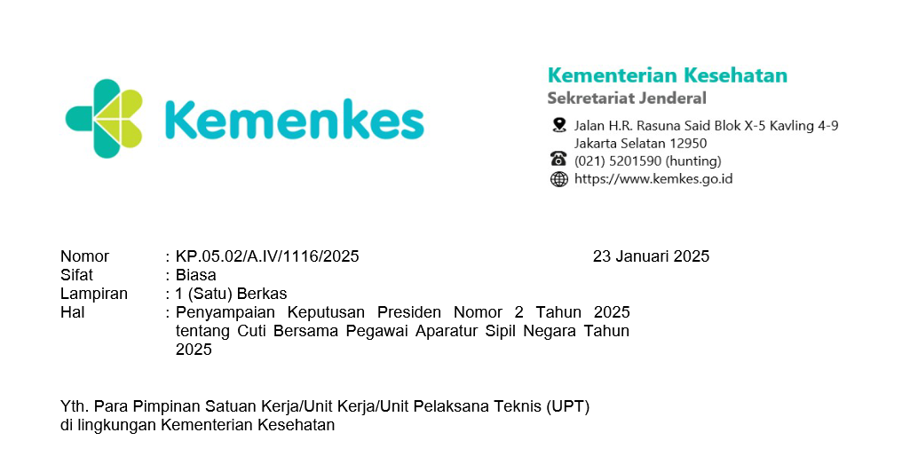 Yth. Para Pimpinan Satuan Kerja/Unit Kerja/Unit Pelaksana Teknis (UPT)di lingkungan Kementerian KesehatanMenindaklanjuti Keputusan Presiden Nomor 2 Tahun 2025 tentang Cuti Bersama Pegawai Aparatur Sipil Negara Tahun 2025, bersama ini kami sampaikan hal-hal sebagai berikut: Cuti Bersama Pegawai Aparatur Sipil Negara Tahun 2025 sebagaimana ditetapkan dalam Keputusan Presiden Nomor 2 Tahun 2025 tentang Cuti Bersama Pegawai Aparatur Sipil Negara Tahun 2025, yaitu: Tanggal 28 Januari 2025 (Selasa) sebagai cuti bersama Tahun Baru Imlek 2576 Kongzili; Tanggal 28 Maret 2025 (Jumat) sebagai cuti bersama Hari Suci Nyepi Tahun Baru Saka 1947; Tanggal 2, 3, 4, dan 7 April 2025 (Rabu, Kamis, Jumat, dan Senin) sebagai cuti bersama Hari Raya Idul Fitri 1446 Hijriyah; Tanggal 13 Mei 2025 (Selasa) sebagai cuti bersama Hari Raya Waisak; Tanggal 30 Mei 2025 (Jumat) sebagai cuti bersama Kenaikan Yesus Kristus; Tanggal 9 Juni 2025 (Senin) sebagai cuti bersama Hari Raya Idul Adha 1446 Hijriyah; dan Tanggal 26 Desember 2025 (Jumat) sebagai cuti bersama Kelahiran Yesus Kristus. Cuti Bersama sebagaimana dimaksud pada angka 1 tidak mengurangi hak cuti tahunan Pegawai Aparatur Sipil Negara. Pegawai Aparatur Sipil Negara di lingkungan Kementerian Kesehatan yang karena jabatannya tidak diberikan hak atas cuti bersama, hak cuti tahunnya ditambah sesuai dengan jumlah cuti yang tidak diberikan. Terlampir kami sampaikan salinan Keputusan Presiden Nomor 2 Tahun 2025 tentang Cuti Bersama Pegawai Aparatur Sipil Negara Tahun 2025 untuk dapat dipedomani dan dilaksanakan sebagaimana mestinya.Demikian disampaikan, atas perhatianya, kami ucapkan terima kasih.Kepla Biro Organisasi dan SDM KemenkesHandrasti Pertiwi, SKM, MHSMUnduh Surat Edaran