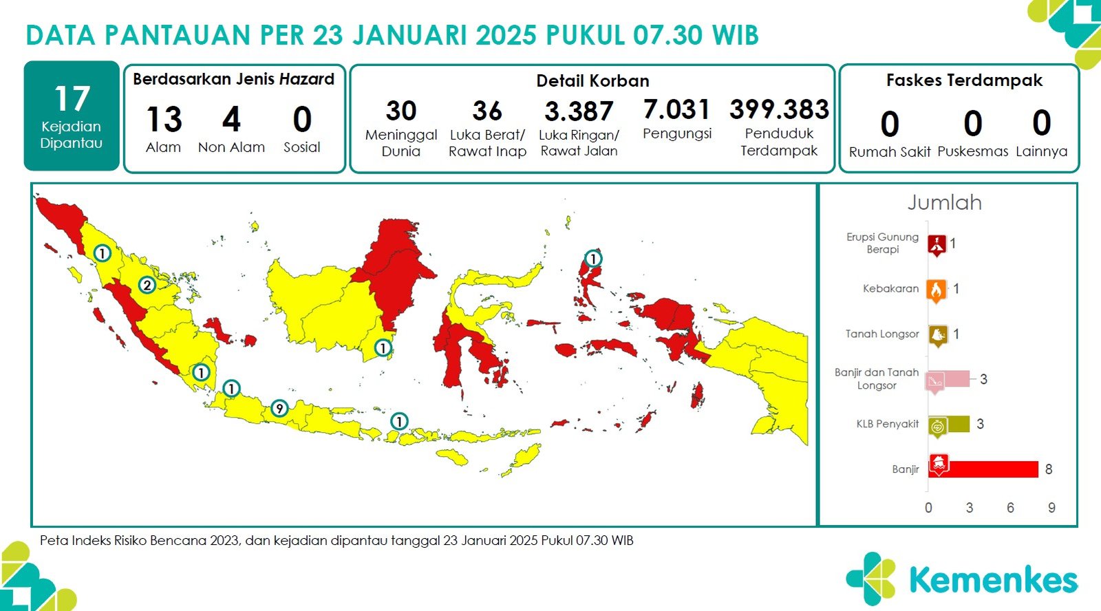 Disini anda dapat mengunduh Laporan Pemantauan Harian Kejadian Krisis Kesehatan Pusat Krisis Kesehatan Kementerian Kesehatan tanggal 22 Januari 2025 pukul 07.30 WIB hingga 23 Januari 2025 pukul 07.30 WIB. Terdapat 17 laporan kejadian bencana: 8 Banjir, 1 Tanah Longsor, 3 Banjir dan Tanah Longsor, 1 Kebakaran, 1 Erupsi Gunung Berapi, dan 3 KLB PenyakitUnduh Laporan Pemantauan Harian Pusat Krisis Kesehatan 23 Januari 2025