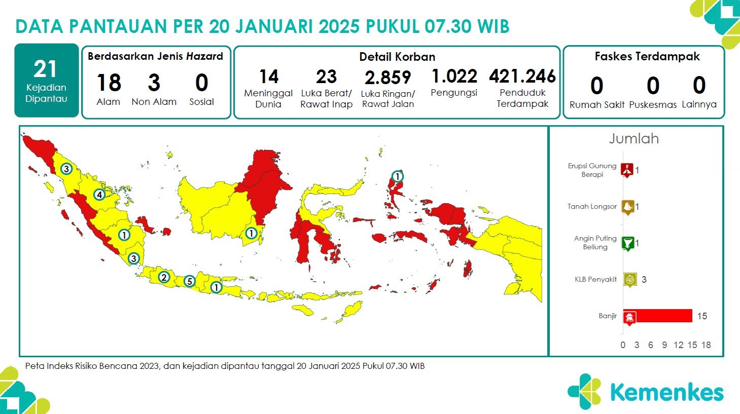 Disini anda dapat mengunduh Laporan Pemantauan Harian Kejadian Krisis Kesehatan Pusat Krisis Kesehatan Kementerian Kesehatan tanggal 19 Januari 2025 pukul 07.30 WIB hingga 20 Januari 2025 pukul 07.30 WIB. Terdapat 21 laporan kejadian bencana: 1 Tanah Longsor, 15 Banjir, 1 Tanah Longsor, 1 Erupsi Gunung Berapi dan 3 KLB Penyakit Unduh Laporan Pemantauan Harian Pusat Krisis Kesehatan 20 Januari 2025