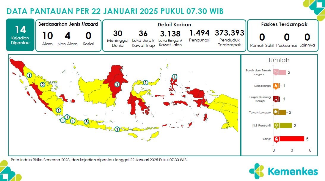 Disini anda dapat mengunduh Laporan Pemantauan Harian Kejadian Krisis Kesehatan Pusat Krisis Kesehatan Kementerian Kesehatan tanggal 21 Januari 2025 pukul 07.30 WIB hingga 22 Januari 2025 pukul 07.30 WIB. Terdapat 14 laporan kejadian bencana: 3 Tanah Longsor, 6 Banjir, 1 Kebakaran, 1 Erupsi Gunung Berapi dan 3 KLB Penyakit Unduh Laporan Pemantauan Harian Pusat Krisis Kesehatan 22 Januari 2025