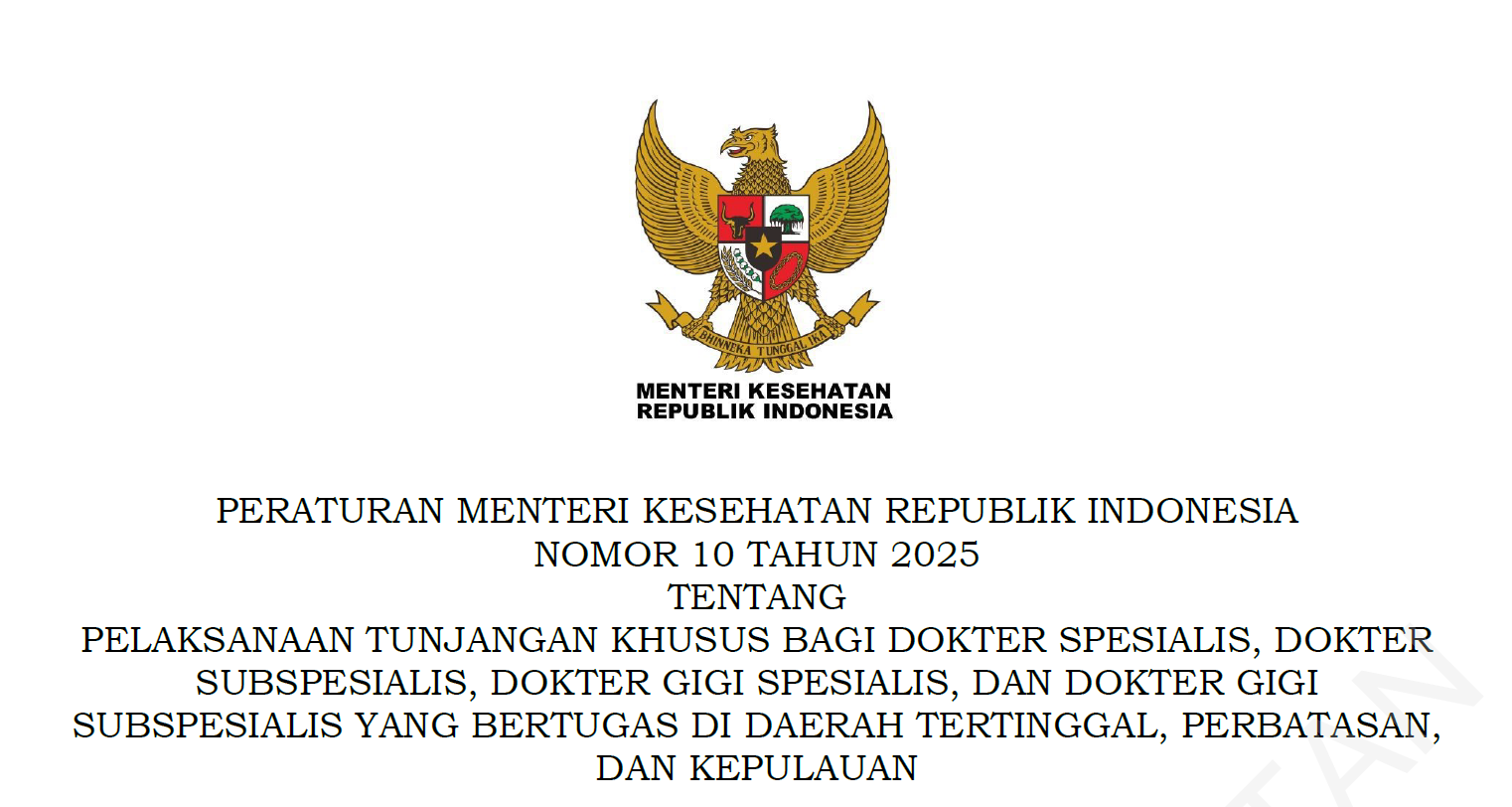 Peraturan Menteri Kesehatan Republik Indonesia Nomor 10 Tahun 2025 Tentang Pelaksanaan Tunjangan Khusus Bagi Dokter Spesialis, Dokter Subspesialis, Dokter Gigi Spesialis, Dan Dokter Gigi Subspesialis Yang Bertugas Di Daerah Tertinggal, Perbatasan, Dan KepulauanUnduh salinan : disini