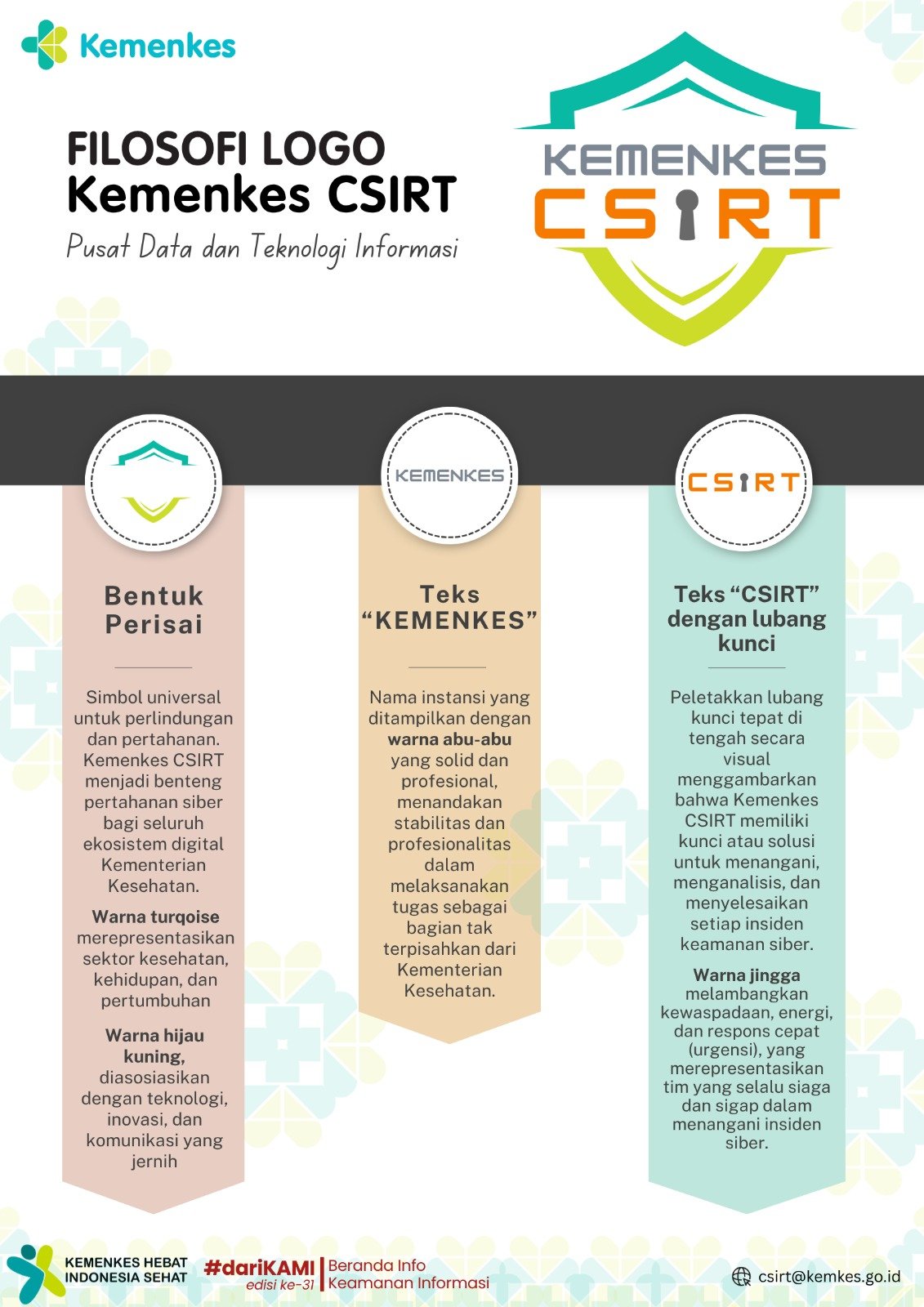 Kementerian Kesehatan memiliki komitmen dalam pengamanan aset digital di lingkungan Kementerian Kesehatan, hal ini ditandai dengan dibentuknya Tim Tanggap Insiden Siber (TTIS) atau biasa disebut juga CSIRT.Kemenkes CSIRT dibentuk pada tahun 2021, dengan tugas utama melakukan pengawasan jaringan serta melakukan tindakan pencegahan apabila terdapat anomali pada sistem Kementerian Kesehatan. Apabila Healthies mendapatkan informasi mengenai kebocoran data ataupun menemukan kerentanan sistem pada Kementerian Kesehatan jangan sungkan untuk lapor melalui e-mail csirt@kemkes.go.idSebuah logo bukan hanya sebuah simbol, tapi juga terdapat makna disetiap bentuk di dalamnya, berikut adalah makna filosofi dari logo Kemenkes CSIRT 🛡️KEAMANAN MENIMBULKAN RASA NYAMAN🛡️#dariKAMI #edisiKe-31 #PusatDatadanTeknologiInformasi #KementerianKesehatan