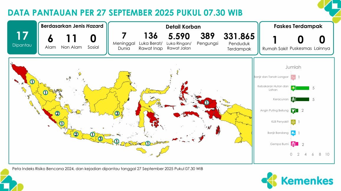 Disini anda dapat mengunduh laporan pemantauan harian berpotensi kejadian Krisis Kesehatan tanggal 26 September 2025 Lihat Laporan Pemantauan Harian Pusat Krisis Kesehatan 27 September 2025