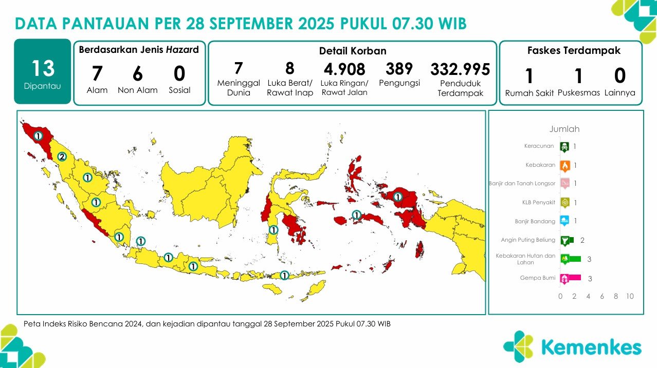Disini anda dapat mengunduh laporan pemantauan harian berpotensi kejadian Krisis Kesehatan tanggal 28 September 2025 Lihat Laporan Pemantauan Harian Pusat Krisis Kesehatan 28 September 2025