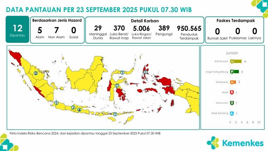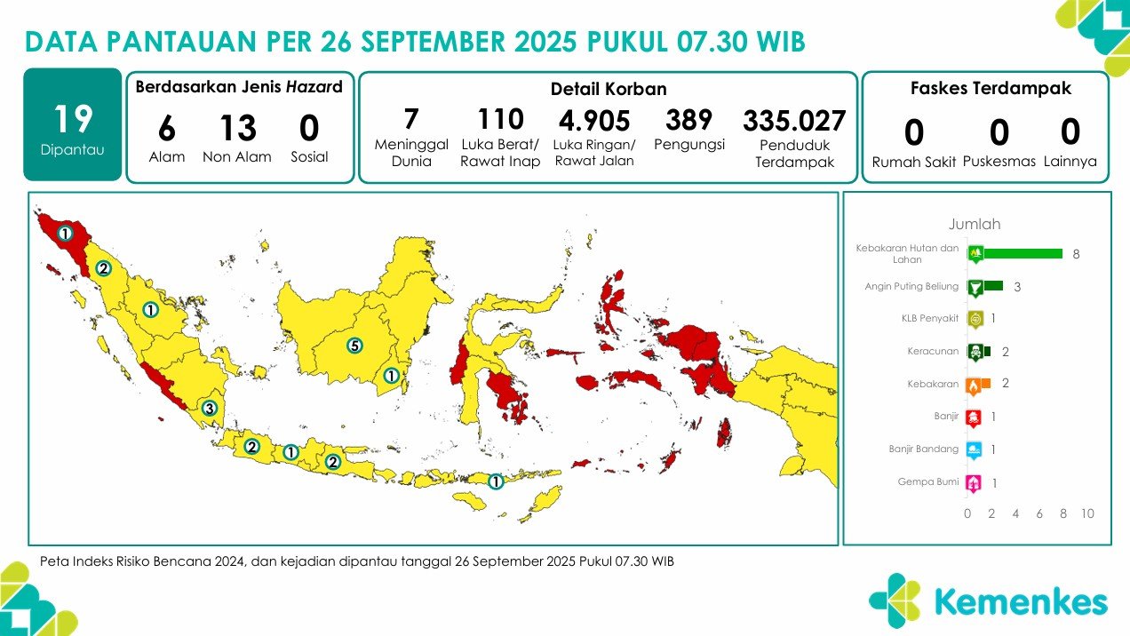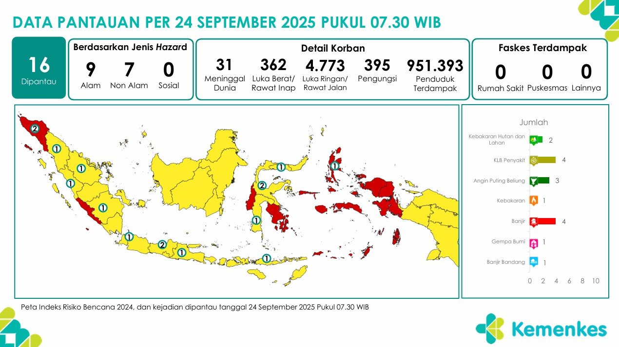 Disini anda dapat mengunduh laporan pemantauan harian berpotensi kejadian Krisis Kesehatan tanggal 25 September 2025 Lihat Laporan Pemantauan Harian Pusat Krisis Kesehatan 25 September 2025