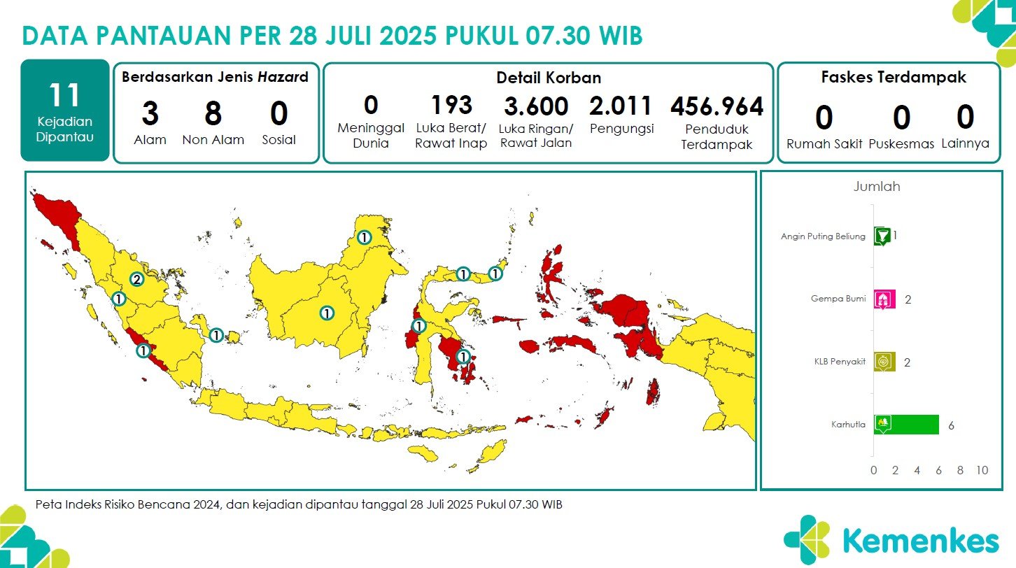 Disini anda dapat mengunduh laporan pemantauan harian berpotensi kejadian Krisis Kesehatan tanggal 28 Juli 2025 Lihat Laporan Pemantauan Harian Pusat Krisis Kesehatan 28 Juli 2025