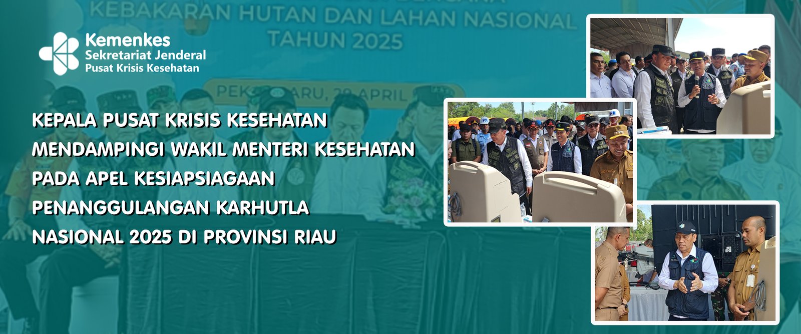 Riau, 29 April 2025Kepala Pusat Krisis Kesehatan mendampingi Wakil Menteri Kesehatan RI, pada acara Apel Kesiapsiagaan Penanggulangan Kebakaran Hutan dan Lahan (Karhutla) Nasional Tahun 2025 di Provinsi Riau pada tanggal 29 April 2025. Kegiatan ini dihadri juga oleh Menteri Koordinator Bidang Politik dan keamanan (Menko Polkam) yang Bertempat di Lapangan Udara Rusmin Nuryadin.Menteri Koordinator Bidang Politik dan Keamanan beserta rombongan melakukan peninjauan gelar pasukan dan peralatan kesiapsiagaan Karhutla untuk mengecek kesiapan personel, alat perangkat dan sumberdaya lain. Pada lawatan di booth Dinas Kesehatan Provinsi Riau Wakil Menteri Kesehatan menyampaikan bahwa Kemenkes telah berpartisipasi mengirimkan logistik kesehatan yaitu 30 unit mesin Oksigen Concentrator dan masker bedah sebanyak 6000 buah sebagai antisipasi terhadap permasalahan kesehatan masyarakat yang timbul.Pada kesempatan yang sama, Kepala Pusat Krisis Kesehatan Bapak Agus Jamaludin menyampaikan bahwa penting untuk dilakukan komunikasi, koordinasi dan kolaborasi disetiap stakeholder yang terkait dalam penanggulangan karhutla sehingga lebih optimal dan efektif. Kapuskrisis juga menyampaikan agar bantuan peralatan kesehatan yang diberikan kepada Dinas Kesehatan Provinsi Riau dapat digunakan sebaik mungkin bagi masyarakat yang membutuhkan.