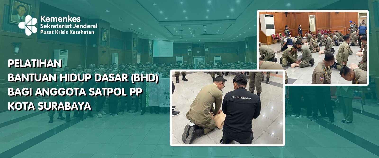Kota Surabaya, 19 November 2024Pusat Krisis Kesehatan Regional Jawa Timur bersama Himpunan Perawat Gawat Darurat dan Bencana Indonesia (HIPGABI) melaksanakan Pelatihan Bantuan Hidup Dasar (BHD) bagi personel Satpol PP Kota Surabaya yang dilaksanakan dalam dua tahap yakni pada tanggal 6 dan 19 November 2024 di Di Gedung Sawunggaling, Balaikota Surabaya. Pada kegiatan ini yang menjadi sasaran adalah Personel Satpol PP Kota Surabaya dengan jumlah peserta sebanyak 1.200 orang.Diharapkan setelah kegiatan ini seluruh peserta memperoleh pengetahuan dan keterampilan dasar dalam pertolongan pertama yang dapat diterapkan pada situasi darurat medis dan juga untuk membangun sinergi antara tim medis dan aparat pemerintah dalam menghadapi situasi kritis di lapangan.Pelatihan ini juga merupakan bagian dari inisiatif berkelanjutan Pusat Krisis Kesehatan untuk memperluas jangkauan pelatihan kesehatan di seluruh provinsi di Indonesia, bekerja sama dengan 11 Regional Pusat Krisis Kesehatan.
