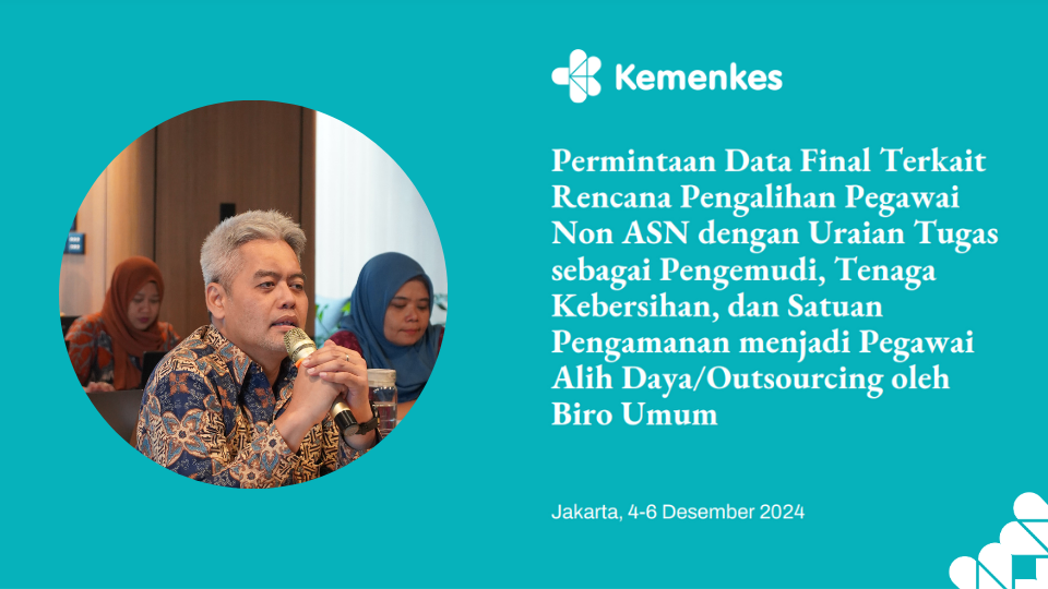 Berdasarkan surat Menteri PANRB nomor B/185/M.SM.02.03/2022 tanggal 31 Mei 2022 hal Status Kepegawaian di Lingkungan Instansi Pemerintah Pusat dan Pemerintah Daerah dan nomor B/1527/M.SM.01.00/2023 tanggal 25 Juli 2023 hal Status dan Kedudukan Eks THK-2 dan Tenaga Non ASN, Kementerian Kesehatan telah menindaklanjuti dengan surat Sekretaris Jenderal nomor KP.01.04/IV/6672/2022 tanggal 2 Agustus 2022 hal Penataan Non-ASN di Lingkungan Kementerian Kesehatan dan nomor KP.01.05/A/37019/2023 tanggal 10 Agustus 2023 hal Status dan Kedudukan Tenaga Non-ASN di Lingkungan Kementerian Kesehatan yang menyampaikan agar setiap pimpinan satuan kerja melakukan pemetaan pegawai non-ASN di lingkungan satuan kerja masing-masing dan bagi yang memenuhi syarat dapat diikutsertakan/diberi kesempatan mengikuti seleksi CPNS/PPPK dan dalam hal satuan kerja membutuhkan tenaga lain seperti pengemudi, tenaga kebersihan, dan satuan pengamanan, dapat dilakukan melalui tenaga alih daya/outsourcing oleh pihak ketiga dan status tenaga alih daya (outsourcing) tersebut bukan merupakan tenaga honorer pada satuan kerja dimaksud.Berkaitan dengan hal tersebut dan dalam rangka penataan pegawai non ASN di lingkungan Kementerian Kesehatan sesuai ketentuan Perundang-Undangan, seluruh pimpinan satuan kerja/unit pelaksana teknis tidak melakukan pengangkatan pegawai non ASN terhitung mulai tanggal 1 Januari 2025 dan melakukan alih daya/outsourcing oleh pihak ketiga terhadap pegawai non ASN yang mempunyai uraian tugas sebagai pengemudi, tenaga kebersihan, dan satuan pengamanan.Didasari dari hal tersebut, Biro Umum diberikan kewenangan untuk mendata seluruh Unit Kerja dan Sekretariat Unit Utama di lingkungan kantor pusat Kementerian Kesehatan terkait rencana pengalihan pegawai Non ASN dengan uraian tugas sebagai pengemudi, tenaga kebersihan, dan satuan pengamanan menjadi pegawai alih daya/outsourcing. Permintaan data final terkait pengalihan pegawai tersebut meliputi alokasi anggaran yang akan dipindahkan dari unit kerja asal ke Biro Umum, data dukung berupa SK KPA/data kontrak/PKWT dan SPTJM yang ditandatangani oleh Kepala Unit Kerja terkait dengan melakukan evaluasi atas kinerja masing masing-masing pegawainya.
