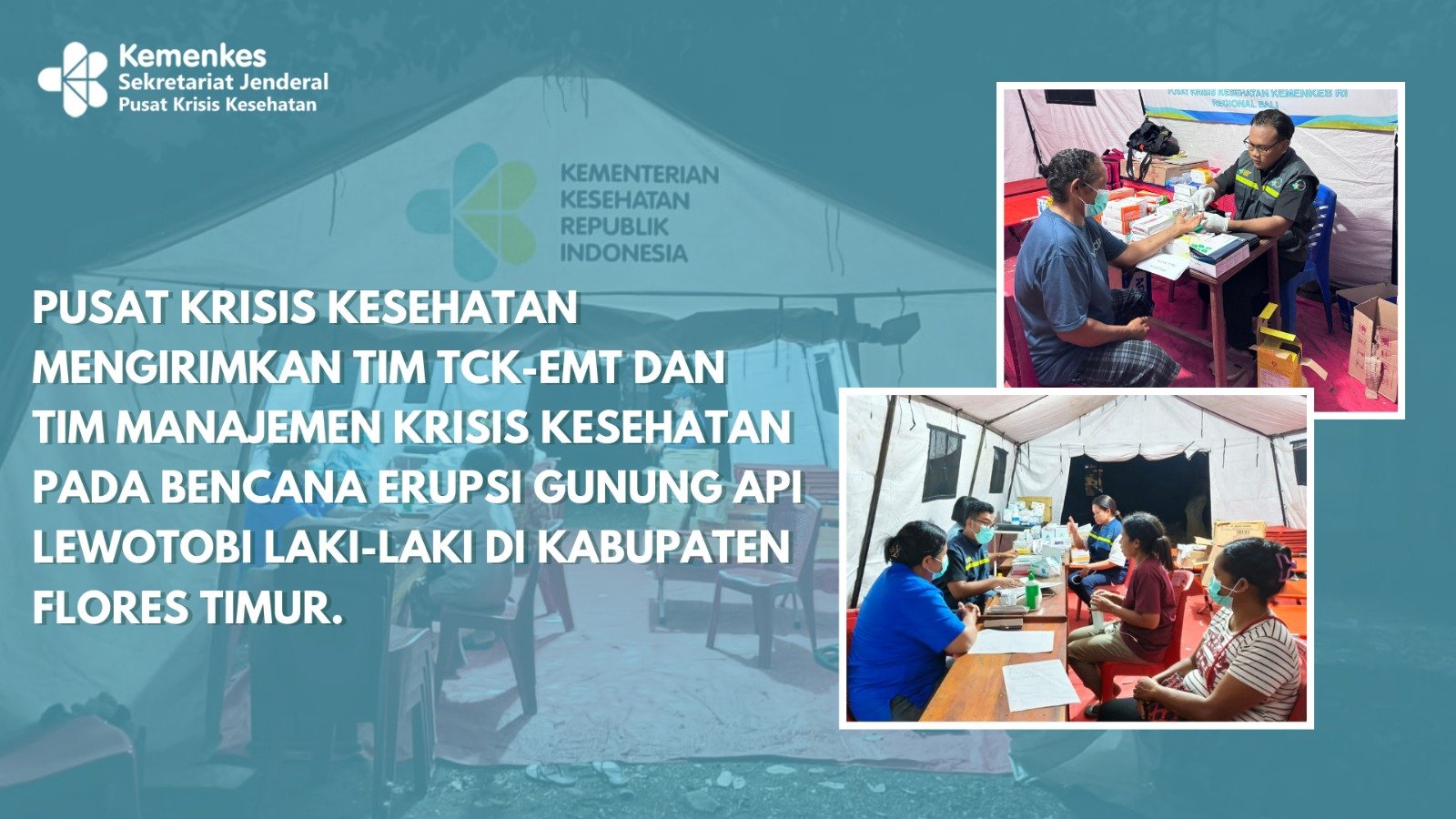 Kabupaten Flores Timur, 3 November 2024Pada tanggal 3 November 2024, Gunung Lewotobi Laki-laki di Kabupaten Flores Timur, Provinsi Nusa Tenggara Timur, mengalami erupsi yang mengakibatkan dampak signifikan terhadap masyarakat di wilayah Kecamatan Wulanggitang dan Ile Bura. Tercatat 9 korban meninggal dunia, 67 korban luka berat dan lebih dari 10.000 orang mengungsi.Bupati Flores Timur mengeluarkan surat keputusan penetapan status tanggap darurat bencana alam erupsi Gunung Lewotobi Laki-laki melalui Keputusan Bupati Flores Timur Nomor BPBD.300.2.2.5/020/BID.KL/IX/2024 tanggal 4 November 2024. Masa tanggap darurat berlaku selama 58 hari, terhitung sejak 4 November 2024 hingga 31 Desember 2024Merespons penetapan tanggap darurat bencana ini, pada tanggal 4 November 2024 Pusat Krisis Kesehatan segera mengirimkan tenaga manajemen penanggulangan krisis kesehatan untuk melakukan pendampingan aktivasi Klaster Kesehatan, menyusul penetapan status tanggap darurat oleh Bupati Flores Timur. Aktivasi Klaster Kesehatan dilakukan guna memastikan pelayanan bagi kesehatan masyarakat terdampak berjalan optimal.Dalam rangka respons cepat membantu pelayanan medis bagi korban erupsi di pengungsian, pada tanggal 14 November 2024, Pusat Krisis Kesehatan memobilisasi TCK-EMT Type 1 Mobile. Pelayanan medis TCK–EMT Type 1 Mobile dilakukan di beberapa lokasi pengungsian seperti pengungsian Bokang, Lewoingu, Ilegerong, Konga dan Kobasoma. Kapasitas TCK-EMT Type 1 Mobile yang dikirim mampu melakukan pelayanan medis dasar rawat jalan dan kegawatdaruratan, mampu melakukan stabilisasi dan rujukan pasien, serta mampu melayani minimal 50 pasien dengan durasi layanan 8 jam per hari setara dengan Puskesmas Keliling. Mobilisasi TCK-EMT Type 1 Mobile untuk membantu pelayanan medis pada bencana erupsi ini menjadi bukti nyata bahwa program TCK mampu merespons kedaruratan dengan cepat dan tepat. Serangkaian pembinaan yang diberikan kepada TCK pada masa pra bencana melalui program TCK, terbukti mampu menyiapkan SDM yang kompeten dan siap dimobilisasi kapan pun dibutuhkan. Hal ini sejalan dengan tujuan transformasi sistem kesehatan, yaitu membangun sistem kesehatan yang tangguh dan mampu menghadapi berbagai ancaman kesehatan melalui pengembangan sumber daya manusia untuk penanganan darurat kesehatan.