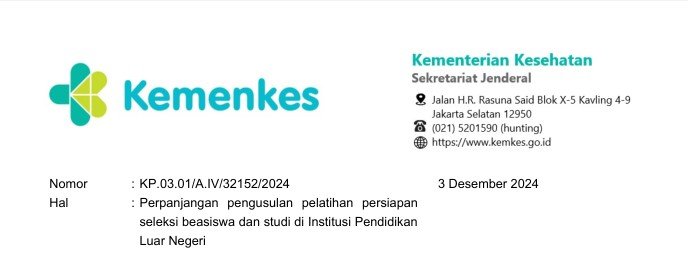 Menyusuli surat kami sebelumnya nomor KP.03.01/A.IV/31557/2024 tanggal 16 November 2024 hal Pelatihan persiapan seleksi beasiswa dan studi di Institusi Pendidikan Luar Negeri, bersama ini disampaikan bahwa pengusulan pegawai yang direkomendasikan untuk mengikuti pelatihan persiapan seleksi beasiswa dan studi di Institusi Pendidikan Luar Negeri yang semula paling lambat kami terima tanggal 30 November 2024, diperpanjang sampai dengan 6 Desember 2024. Untuk informasi lebih lanjut dapat menghubungi Sdr. Elvi Adelina (081314502324) dan sdr. Evi Palzati (082125161698)Unduh Surat Edaran