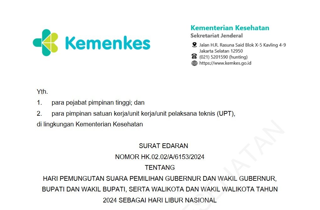 Dalam rangka menindaklanjuti Keputusan Presiden Nomor 33 Tahun 2024 tentang Hari Pemungutan Suara Pemilihan Gubernur dan Wakil Gubernur, Bupati dan Wakil Bupati, serta Walikota dan Wakil Walikota Tahun 2024 sebagai Hari Libur Nasional, perlu menetapkan surat edaran agar pegawai di lingkungan Kementerian Kesehatan dapat menggunakan hak pilihnya sebagai warga negara sesuai dengan ketentuan peraturan perundang-undangan. Surat Edaran ini merupakan acuan bagi para pejabat pimpinan tinggi dan para pimpinan satuan kerja/unit kerja/unit pelaksana teknis (UPT) dalam pelaksanaan hari libur pada hari pemungutan suara pemilihan gubernur dan wakil gubernur, bupati dan wakil bupati, serta walikota dan wakil walikota tahun 2024 di lingkungan Kementerian Kesehatan.Mengingat ketentuan: Undang-Undang Nomor 1 Tahun 2015 tentang Penetapan Peraturan Pemerintah Pengganti Undang-Undang Nomor 1 Tahun 2014 tentang Pemilihan Gubernur, Bupati, dan Walikota menjadi Undang-Undang (Lembaran Negara Republik Indonesia Tahun 2015 Nomor 23, Tambahan Lembaran Negara Republik Indonesia Nomor 5656) sebagaimana telah beberapa kali diubah terakhir dengan Undang-Undang Nomor 6 Tahun 2020 tentang Penetapan Peraturan Pemerintah Pengganti Undang-Undang Nomor 2 Tahun 2020 tentang Perubahan Ketiga atas Undang-Undang Nomor 1 Tahun 2015 tentang Penetapan Peraturan Pemerintah Pengganti Undang-Undang Nomor 1 Tahun 2014 tentang pemilihan Gubernur, Bupati, dan Walikota menjadi Undang-Undang (Lembaran Negara Republik Indonesia Tahun 2020 Nomor 193, Tambahan Lembaran Negara Republik Indonesia Nomor 6547); Undang-Undang Nomor 20 Tahun 2023 tentang Aparatur Sipil Negara (Lembaran Negara Republik Indonesia Tahun 2023 Nomor 141, Tambahan Lembaran Negara Republik Indonesia Nomor 6897); Peraturan Pemerintah Nomor 11 Tahun 2017 tentang Manajemen Pegawai Negeri Sipil (Lembaran Negara Republik Indonesia Tahun 2017 Nomor 63, Tambahan Lembaran Negara Republik Indonesia Nomor 6037) sebagaimana telah diubah dengan Peraturan Pemerintah Nomor 17 Tahun 2020 tentang Perubahan atas Peraturan Pemerintah Nomor 11 Tahun 2017 tentang Manajemen Pegawai Negeri Sipil (Lembaran Negara Republik Indonesia Tahun 2020 Nomor 68, Tambahan Lembaran Negara Republik Indonesia Nomor 6477); Peraturan Pemerintah Nomor 49 Tahun 2018 tentang Manajemen Pegawai Pemerintah dengan Perjanjian Kerja (Lembaran Negara Republik Indonesia Tahun 2018 Nomor 224, Tambahan Lembaran Negara Republik Indonesia Nomor 6264); Peraturan Pemerintah Nomor 94 Tahun 2021 tentang Disiplin Pegawai Negeri Sipil (Lembaran Negara Republik Indonesia Tahun 2021 Nomor 202, Tambahan Lembaran Negara Republik Indonesia Nomor 6718); Peraturan Presiden Nomor 21 Tahun 2023 tentang Hari Kerja dan Jam Kerja Instansi Pemerintah dan Pegawai Aparatur Sipil Negara (Lembaran Negara Republik Indonesia Tahun 2023 Nomor 50); Keputusan Presiden Nomor Nomor 33 Tahun 2024 tentang Hari Pemungutan Suara Pemilihan Gubernur dan Wakil Gubernur, Bupati dan Wakil Bupati, serta Walikota dan Wakil Walikota Tahun 2024 sebagai Hari Libur Nasional; Peraturan Menteri Kesehatan Nomor 5 Tahun 2022 tentang Organisasi dan Tata Kerja Kementerian Kesehatan (Berita Negara Republik Indonesia Tahun 2022 Nomor 156); Keputusan Bersama Menteri Pendayagunaan Aparatur Negara dan Reformasi Birokrasi, Menteri Dalam Negeri, Kepala Badan Kepegawaian Negara, Ketua Komisi Aparatur Sipil Negara, dan Ketua Badan Pengawas Pemilihan Umum Nomor 2 Tahun 2022, Nomor 800-5474 Tahun 2022, Nomor 246 Tahun 2022, Nomor 30 Tahun 2022, Nomor 1447.1/PM.01/K.1/09/2022 tentang Pedoman Pembinaan dan Pengawasan Netralitas Pegawai Aparatur Sipil Negara dalam Penyelenggaraan Pemilihan Umum dan Pemilihan; Surat Edaran Menteri Pendayagunaan Aparatur Negara dan Reformasi Birokrasi Nomor 1 Tahun 2023 tentang Pedoman Pembinaan dan Pengawasan Netralitas Pegawai Pemerintah Non Pegawai Negeri dalam Penyelenggaraan Pemilihan Umum dan Pemilihan; Surat Edaran Menteri Pendayagunaan Aparatur Negara dan Reformasi Birokrasi Nomor 18 Tahun 2023 tentang Netralitas Pegawai Aparatur Sipil Negara yang Memiliki Pasangan (Suami/Istri) Berstatus sebagai Calon Kepala Daerah/Wakil Kepala Daerah, Calon Anggota Legislatif, dan Calon Presiden/Wakil Presiden.Sehubungan dengan hal tersebut, disampaikan kepada para pejabat pimpinan tinggi dan para pimpinan satuan kerja/unit kerja/unit pelaksana teknis (UPT) di lingkungan Kementerian Kesehatan hal-hal sebagai berikut: Berdasarkan Keputusan Presiden Nomor Nomor 33 Tahun 2024 tentang Hari Pemungutan Suara Pemilihan Gubernur dan Wakil Gubernur, Bupati dan Wakil Bupati, serta Walikota dan Wakil Walikota Tahun 2024 sebagai Hari Libur Nasional, hari Rabu tanggal 27 November 2024 ditetapkan sebagai hari libur nasional. Para pegawai di lingkungan Kementerian Kesehatan agar dapat menggunakan hak pilihnya sebagai warga negara pada pemilihan gubernur dan wakil gubernur, bupati dan wakil bupati, serta walikota dan wakil walikota tahun 2024 sesuai ketentuan peraturan perundang-undangan. Para pimpinan pada satuan kerja/unit kerja/unit pelaksana teknis (UPT) yang memberikan layanan langsung kepada masyarakat, seperti rumah sakit, balai kekarantinaan kesehatan, dan unit pelayanan kesehatan lainnya dapat melakukan penyesuaian pengaturan tugas dinas sesuai kebutuhan sehingga pemberian pelayanan langsung kepada masyarakat tetap berjalan dengan efektif. Para pejabat pimpinan tinggi dan pimpinan satuan kerja/unit kerja/unit pelaksana teknis (UPT) agar memastikan pelaksanaan Surat Edaran, pemantauan netralitas, serta mengambil langkah-langkah penegakan disiplin sesuai ketentuan peraturan perundang-undangan.Demikian Surat Edaran ini untuk dapat dilaksanakan dengan penuh tanggung jawab sesuai dengan ketentuan peraturan perundang-undangan.Unduh Surat Edaran