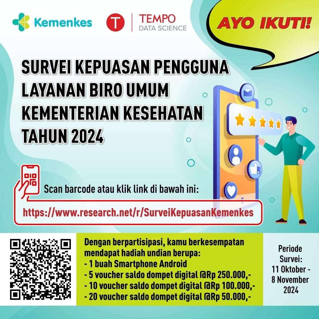 Sehubungan dengan pelaksanaan Survei Kepuasan Layanan Biro Umum di Lingkungan Kementerian Kesehatan Tahun 2024, bersama ini kami beritahukan bahwa akan dilaksanakan survey yang akan dilakukan oleh Biro Umum yang bekerja sama dengan Pusat Data dan Analisa Tempo (Tempo Media Group). Survei Kepuasan Layanan Biro Umum ini bertujuan untuk memperoleh gambaran tingkat kepuasan pelayanan administrasi digitalisasi arsip dan kepuasan pelanggan/ stakeholder.Kami mengharapkan bantuan Saudara untuk menginformasikan kepada seluruh ASN (PNS dan PPPK) untuk berpartisipasi aktif mengisi kuesioner survey secara mandiri melalui akses online. Durasi pengisian kuesioner berlangsung hingga 15 – 20 menit.Sebagai informasi, dapat kami sampaikan bahwa Kementerian Kesehatan tidak memungut biaya apapun atas pelayanan yang diberikan, dan untuk menjaga integritas maka diharapkan tidak menyampaikan pemberian dalam bentuk apapun kepada pejabat/ pegawai Kementerian Kesehatan.Surat Penyampaian Survei Kepuasan Layanan Biro Umum 2024